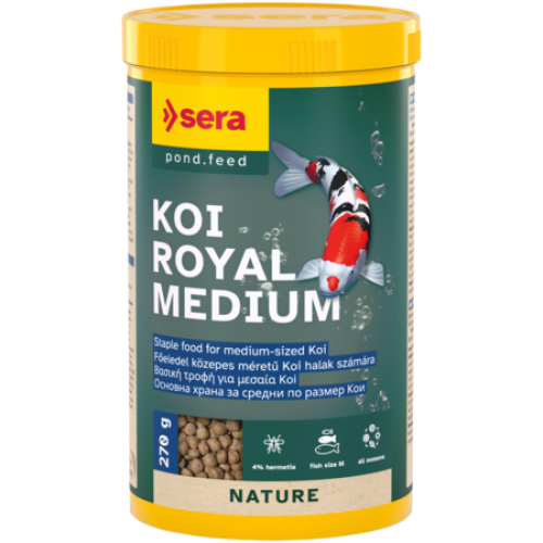 Sera KOI ROYAL подпомага здравословния растеж на младите и растящи кои. Идеална за хранене през цялата година. Лесносмилаема с балансирани минерали, микроелементи. Добавените витамини подпомагат естествената имунна защита и здравето на кои.